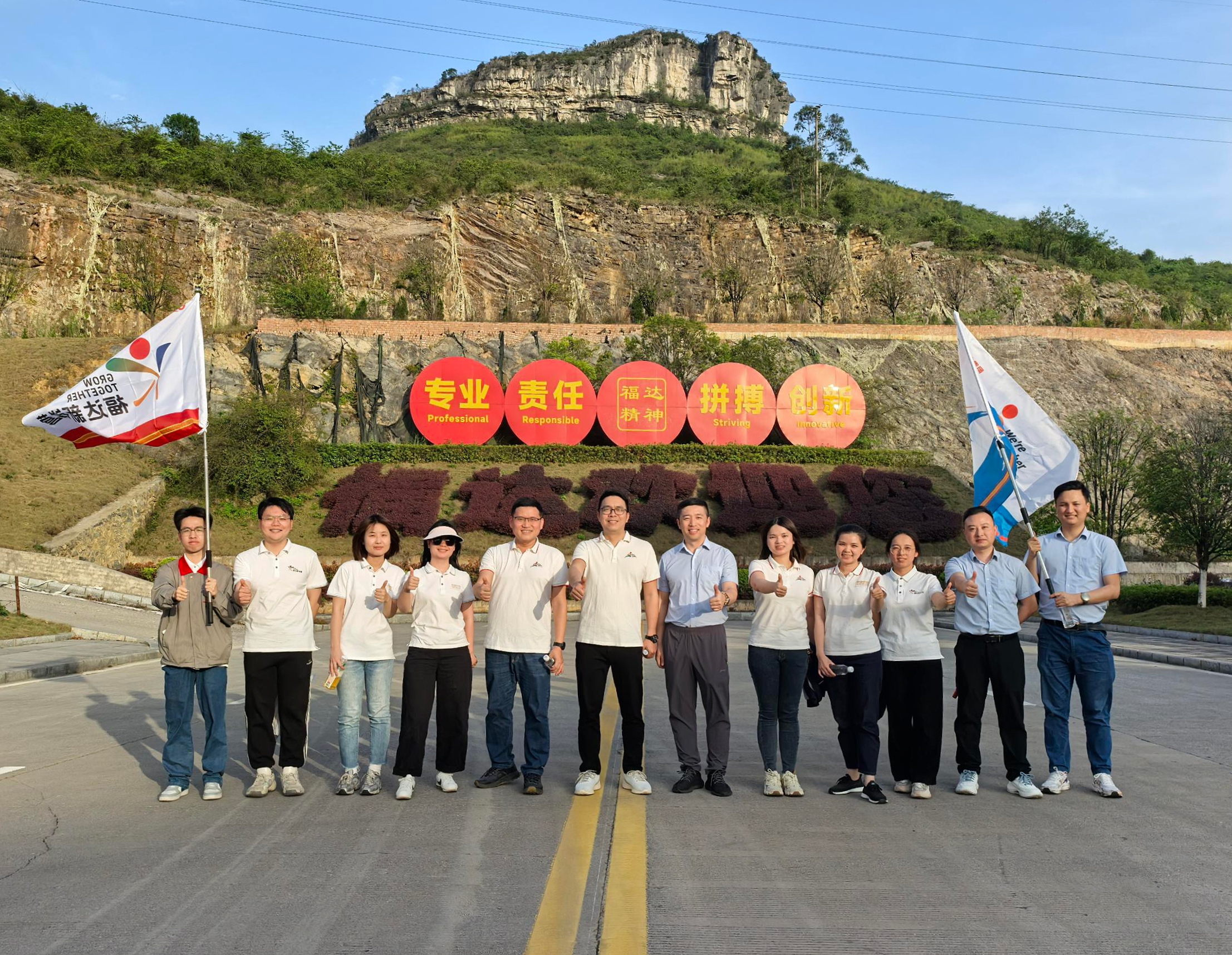 位于公司辦公區(qū)附近的官帽山因其形似古代官帽而得名,在當(dāng)?shù)厮赜?/span>“登高納福”的吉祥寓意。活動(dòng)當(dāng)天,來(lái)自福達(dá)青年互學(xué)營(yíng)與新銳營(yíng)的十余名青年員工代表齊聚山腳。盡管山路未經(jīng)人工修葺,但大家以蓬勃朝氣迎難而上,途中彼此攙扶提醒,于協(xié)作中突破崎嶇路段,最終全員成功登頂。山巔之上,青年們揮灑汗水的身影與迎風(fēng)招展的旗幟交相輝映,展現(xiàn)出福達(dá)青年們昂揚(yáng)向上的精神風(fēng)貌。